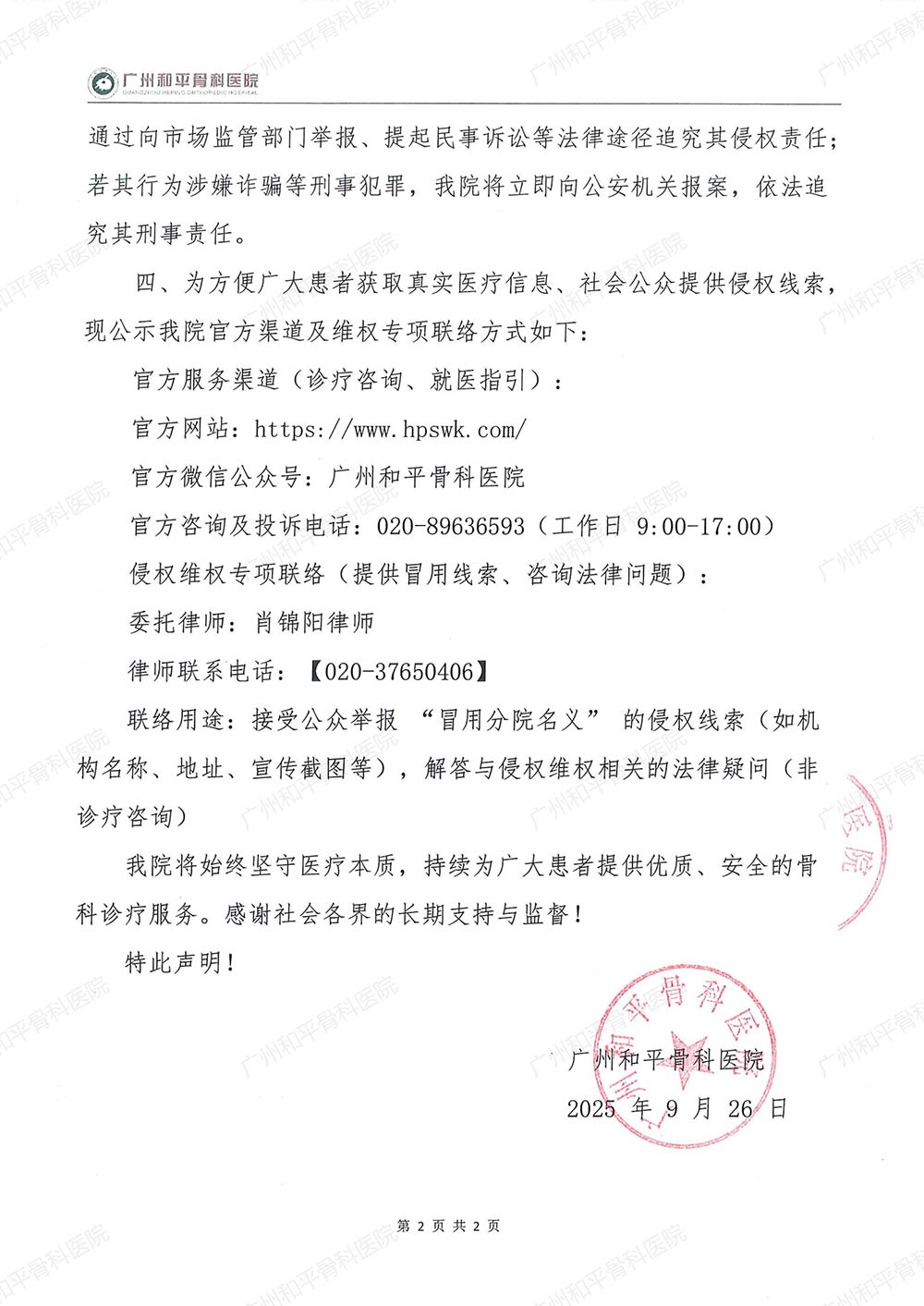一、我院从未以任何形式开设、授权设立分支机构(含分院、分门诊、合作诊疗点等),未与任何机构达成过 “分院”“联合诊疗” 等合作协议。任何机构或个人以“广州和平骨科医院分院”或类似名义进行宣传、开展诊疗活动的行为,均涉嫌构成虚假宣传及不正当竞争,已违反相关法律法规规定。